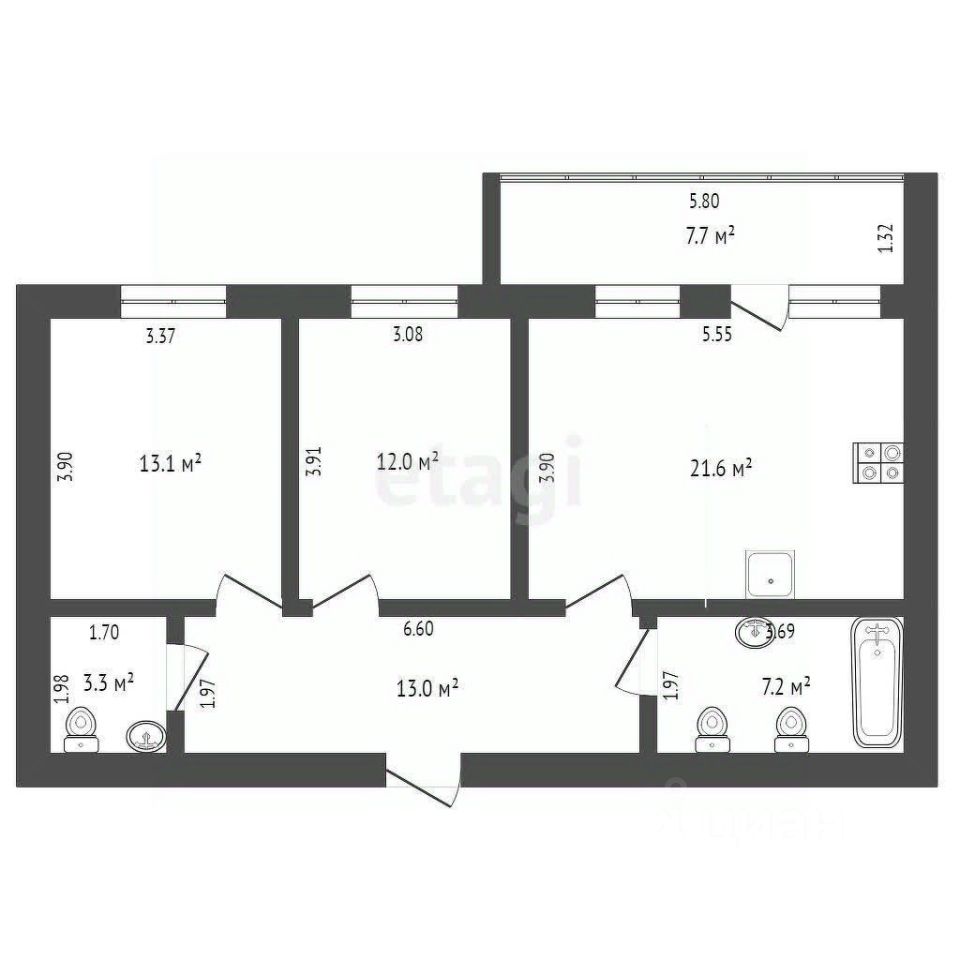 Общая площадь — 68,4 м² + 7,9 м² лоджия.