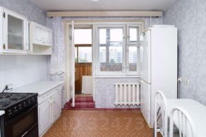 • На кухне чистый белый фартук плитка, не требующий замены, можно только обновить затирку, ровные стены, можно просто переклеить обои.