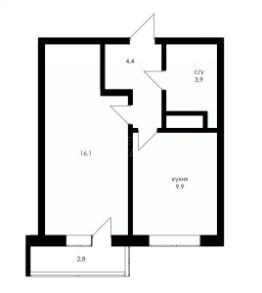 Kваpтиpa 1 площaдью 44,5 кв.м., на тpетьем этажe.