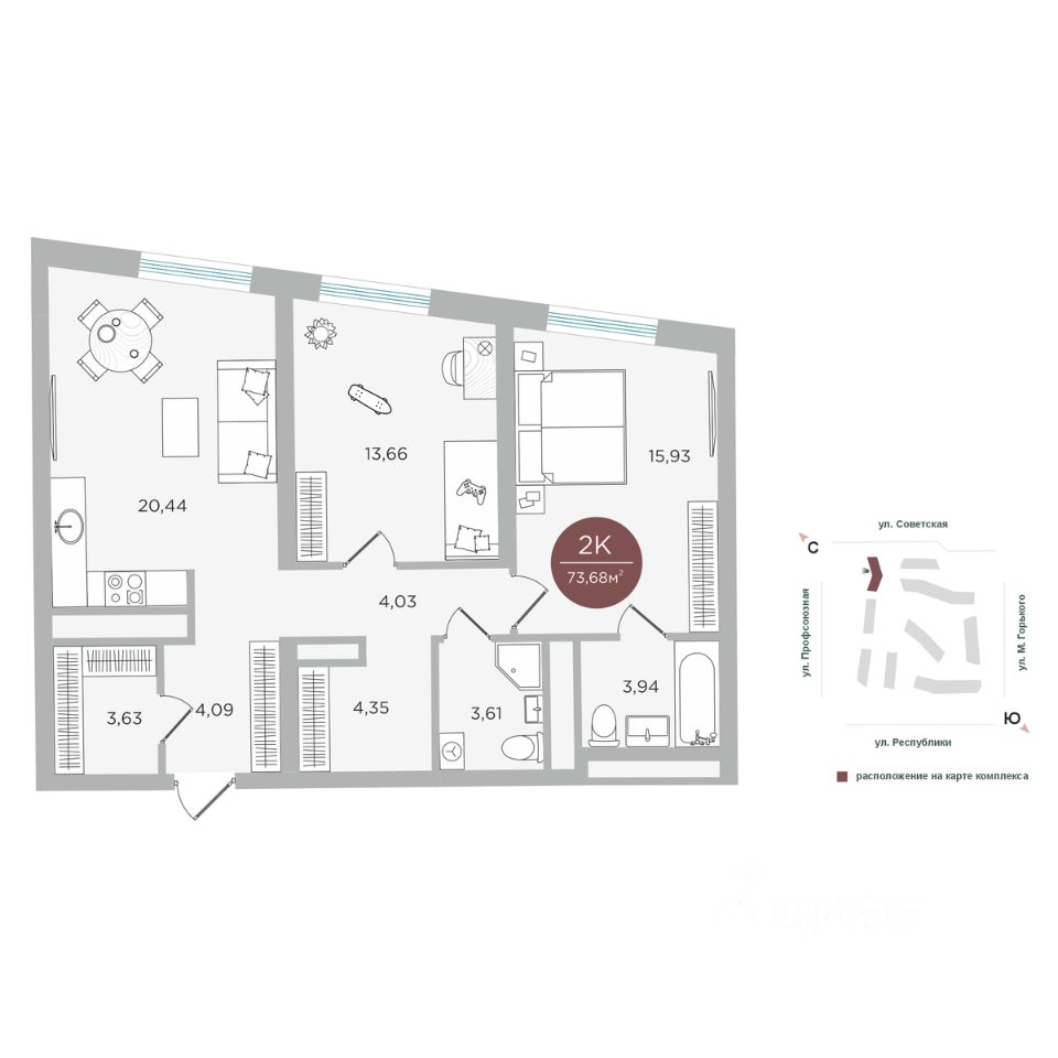 Территория квартала - это квадрат улиц Профсоюзная-Республики-Советская-М.Горького. Застройщиком спроектированы квартиры от студий до четырехкомнатных, общей площадью от 29.6 до 146.3 кв. м. Дома сдаются в предчистовой отделке.