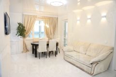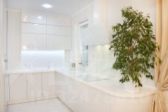 В кухне гостинной кухонный гарнитур из дорогостоящего материала в качественном исполнении с установленной каменной столешницей. Встроенная немецкая бытовая техника. На полу во всей квартире бесшовно выложен пол из белого кварц-винила, что позволяет сохранять комфортную температуру пола и при этом выдерживать твёрдую и ровную структуру пола. В каждой комнате наклеены качественные итальянские , плотные обои. Потолок натяжной во всей квартире . В гостиной оборудовано четыре