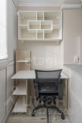 Квартира меблирована диваном, компьютерным столом и полками, что обеспечивает дополнительное удобство.