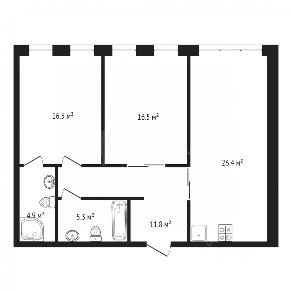 Где кухня - гостиная 30 м2, мастер-спальня 17 м2 и еще одна спальня 17 м2.