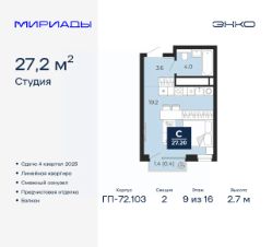 Однокомнатная квартира-студия с предчистовой отделкой в ЖК "Мириады" на 9 этаже. Общая площадь: 27.2 кв.м., площадь гостиной 19.2 кв.м., из которых 5 кв.м. выделено под кухонную зону. Все окна выходят на одну сторону. В квартире один балкон, один совмещенный санузел. Высота потолков 2.7 м.