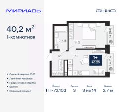 1-комн. квартира с предчистовой отделкой в ЖК "Мириады" на 3 этаже. Общая площадь: 40.2 кв.м., жилая: 14.3 кв.м., площадь просторной кухни-столовой: 15.2 кв.м. Все окна выходят на одну сторону. В квартире два балкона, один совмещенный санузел. Высота потолков 2.7 м.
