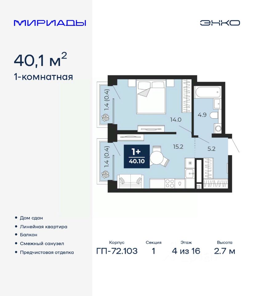 Однокомнатная квартира от застройщика с предчистовой отделкой в ЖК "Мириады" на 4 этаже. Общая площадь: 40.1 кв.м., жилая: 14 кв.м., площадь просторной кухни-столовой: 15.2 кв.м. Все окна выходят на одну сторону. В квартире два балкона, один совмещенный санузел. Высота потолков 2.7 м.