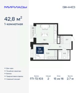 1-комн. квартира от застройщика с предчистовой отделкой в ЖК "Мириады" на 15 этаже. Общая площадь: 42.8 кв.м., жилая: 12.9 кв.м., площадь просторной кухни-столовой: 16.1 кв.м. Все окна выходят на одну сторону. В квартире один балкон, один совмещенный санузел. Высота потолков 2.7 м.