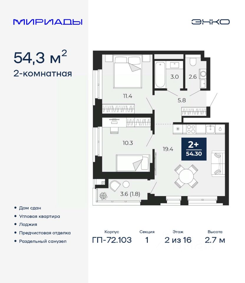 Продается двухкомнатная квартира с предчистовой отделкой в ЖК "Мириады" на 2 этаже. Общая площадь: 54.3 кв.м., жилая: 21.7 кв.м., площадь просторной кухни-столовой: 19.4 кв.м. Квартира угловая, идеально подойдет любителям тишины и панорамных видов. В квартире одна лоджия, один раздельный санузел. Высота потолков 2.7 м.