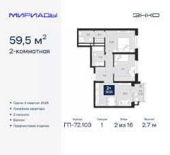2-комн. квартира от застройщика с предчистовой отделкой в ЖК "Мириады" на 2 этаже. Общая площадь: 59.5 кв.м., жилая: 23.9 кв.м., площадь просторной кухни-столовой: 16.5 кв.м. Комнаты изолированные, все окна выходят на одну сторону. В квартире один балкон, два совмещенных санузла. Высота потолков 2.7 м.