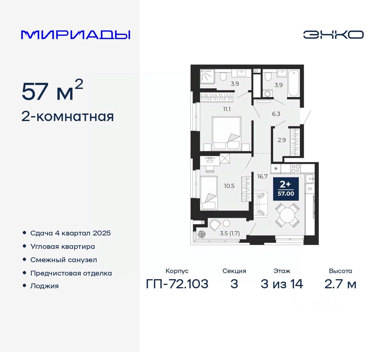 Продается двухкомнатная квартира с предчистовой отделкой в ЖК "Мириады" на 3 этаже. Общая площадь: 57 кв.м., жилая: 21.6 кв.м., площадь просторной кухни-столовой: 16.7 кв.м. Квартира угловая, окна oбecпeчивaют paвнoмepнoe ocвeщeниe в тeчeниe дня. В квартире одна лоджия, один совмещенный санузел. Высота потолков 2.7 м.