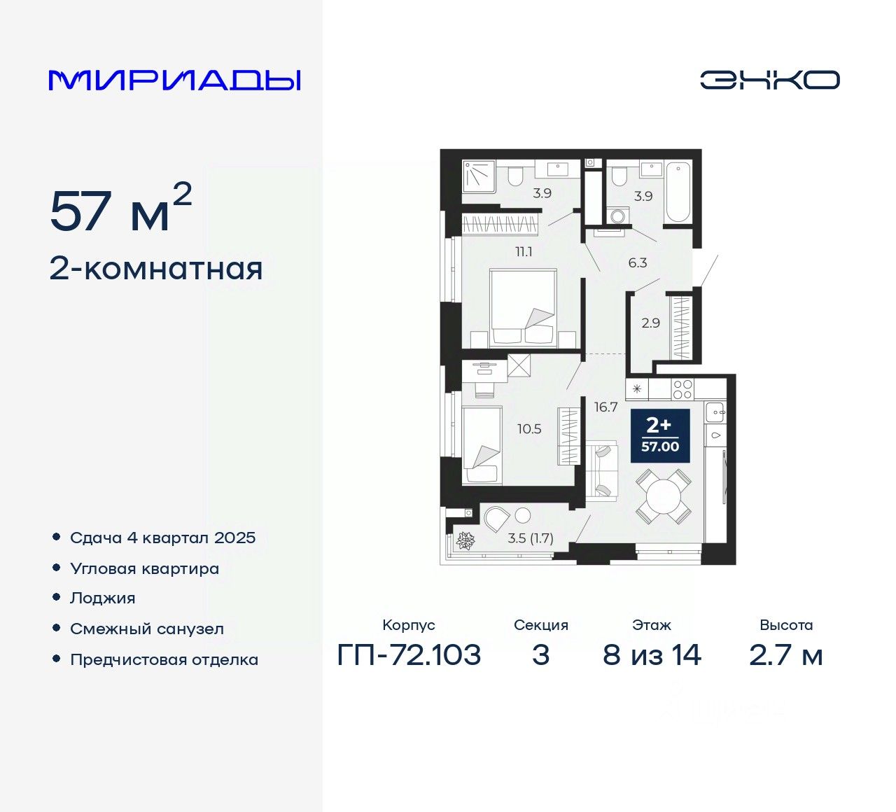 Продается 2-комн. квартира с предчистовой отделкой в ЖК "Мириады" на 8 этаже. Общая площадь: 57 кв.м., жилая: 21.6 кв.м., площадь просторной кухни-столовой: 16.7 кв.м. Квартира угловая, очень светлая, естественная вентиляция при открытии окон. В квартире одна лоджия, один совмещенный санузел. Высота потолков 2.7 м.