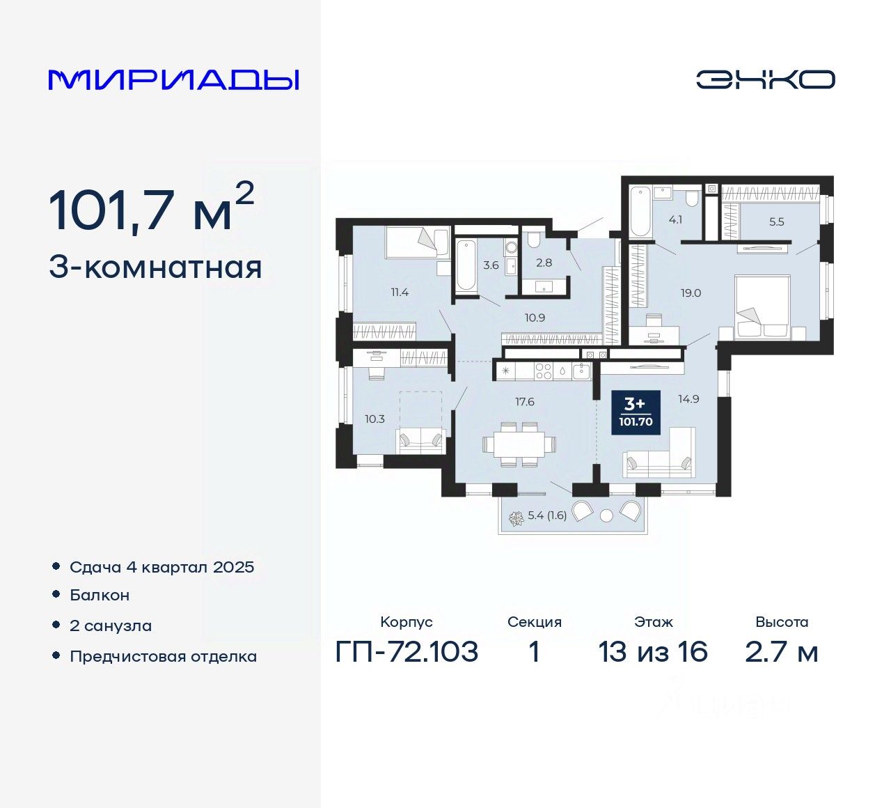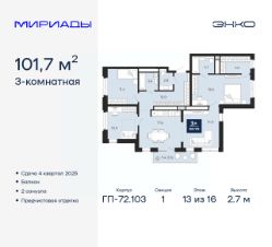 Трехкомнатная квартира с предчистовой отделкой в ЖК "Мириады" на 13 этаже. Общая площадь: 101.7 кв.м., жилая: 40.7 кв.м., площадь просторной кухни-столовой: 32.5 кв.м. Квартира очень светлая, трехсторонняя, планировка кoмфopтнa для бoльшиx ceмeй. В квартире один балкон, два совмещенных санузла. Высота потолков 2.7 м.