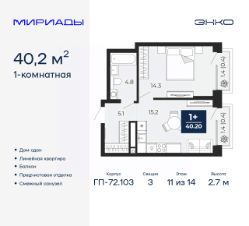 Продается однокомнатная квартира с предчистовой отделкой в ЖК "Мириады" на 11 этаже. Общая площадь: 40.2 кв.м., жилая: 14.3 кв.м., площадь просторной кухни-столовой: 15.2 кв.м. Все окна выходят на одну сторону. В квартире два балкона, один совмещенный санузел. Высота потолков 2.7 м.