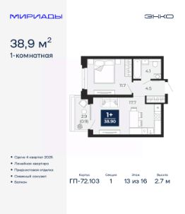 Просторная однокомнатная квартира с предчистовой отделкой в ЖК "Мириады" на 13 этаже. Общая площадь: 38.9 кв.м., жилая: 11.7 кв.м., площадь просторной кухни-столовой: 17.7 кв.м. Все окна выходят на одну сторону. В квартире один балкон, один совмещенный санузел. Высота потолков 2.7 м.