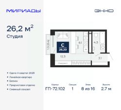 Продается 1-комн. квартира-студия с предчистовой отделкой в ЖК "Мириады" на 8 этаже. Общая площадь: 26.2 кв.м., площадь гостиной 18.4 кв.м., из которых 6.1 кв.м. выделено под кухонную зону. Все окна выходят на одну сторону. В квартире один балкон, один совмещенный санузел. Высота потолков 2.7 м.