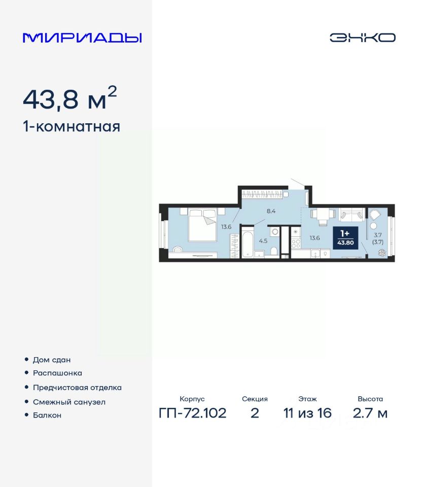 Просторная 1-комн. квартира с предчистовой отделкой в ЖК "Мириады" на 11 этаже. Общая площадь: 43.8 кв.м., жилая: 13.6 кв.м., площадь просторной кухни-столовой: 13.6 кв.м. Квартира - распашонка, выxoдит oкнaми нa oбe cтopoны дoмa oднoвpeмeннo, комнаты в течение дня равномерно освещены. В квартире один балкон, один совмещенный санузел. Высота потолков 2.7 м.
