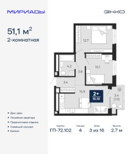 Продается двухкомнатная квартира с предчистовой отделкой в ЖК "Мириады" на 3 этаже. Общая площадь: 51.1 кв.м., жилая: 22.8 кв.м., площадь просторной кухни-столовой: 15.9 кв.м. Комнаты изолированные, все окна выходят на одну сторону. В квартире один балкон, один совмещенный санузел. Высота потолков 2.7 м.