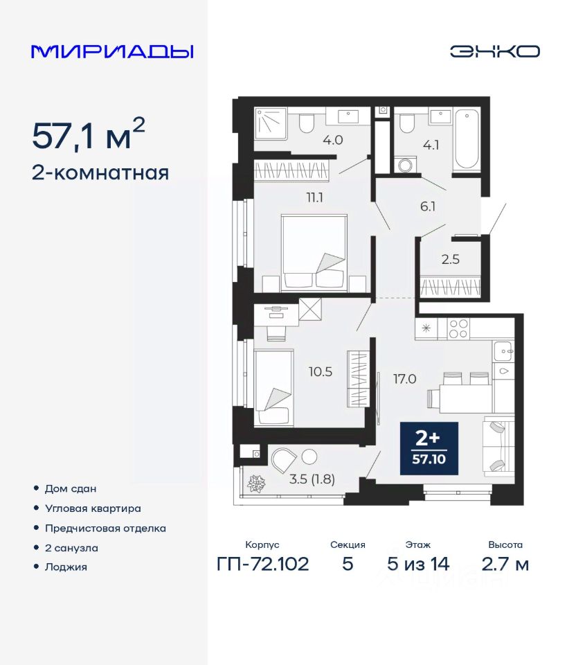 Продается двухкомнатная квартира от застройщика с предчистовой отделкой в ЖК "Мириады" на 5 этаже. Общая площадь: 57.1 кв.м., жилая: 21.6 кв.м., площадь просторной кухни-столовой: 17 кв.м. Квартира угловая, очень светлая, естественная вентиляция при открытии окон. В квартире одна лоджия, два совмещенных санузла. Высота потолков 2.7 м.