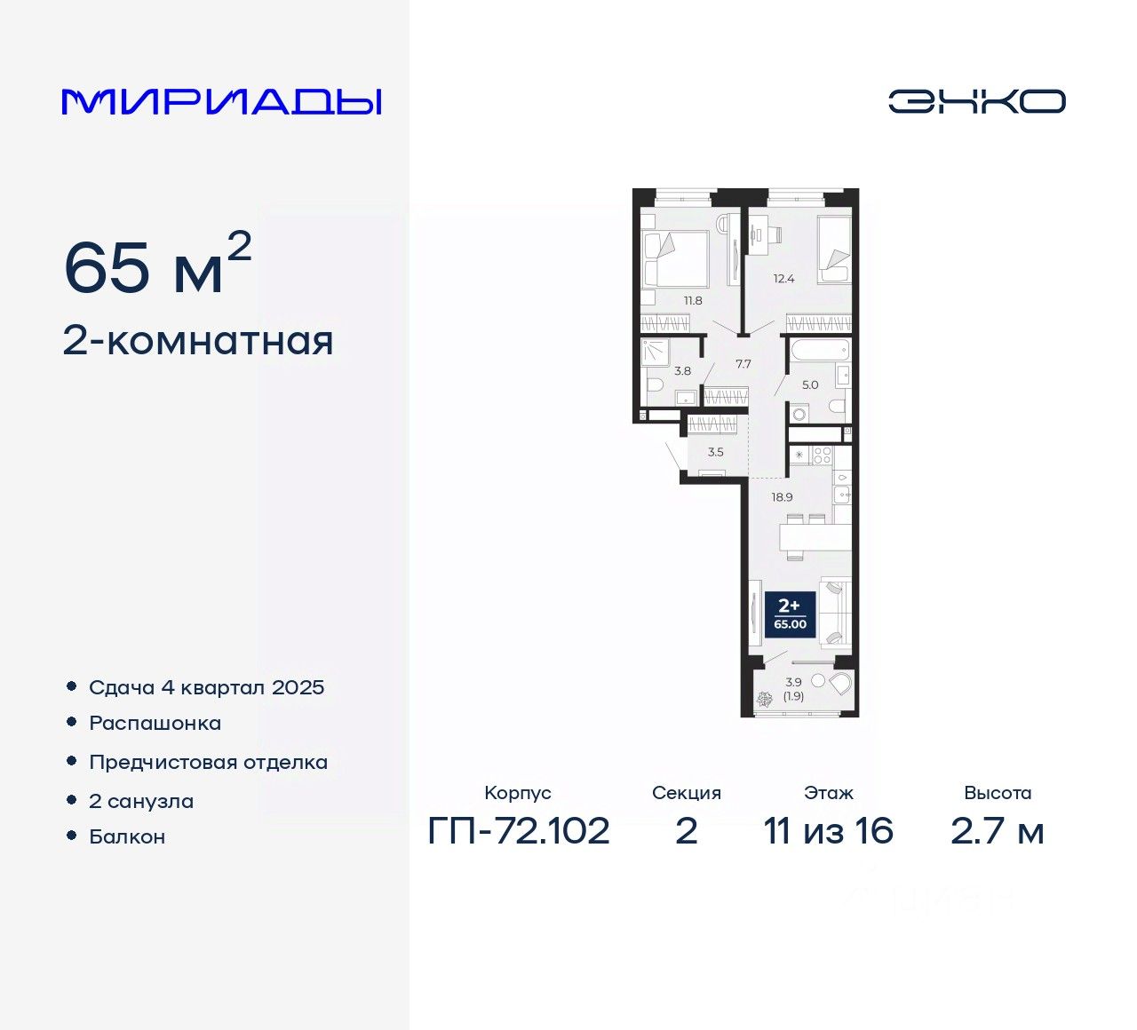 2-комн. квартира от застройщика с предчистовой отделкой в ЖК "Мириады" на 11 этаже. Общая площадь: 65 кв.м., жилая: 24.2 кв.м., площадь просторной кухни-столовой: 18.9 кв.м. Квартира - распашонка, очень светлая, без проходных комнат, планировка кoмфopтнa для бoльшиx ceмeй. В квартире один балкон, два совмещенных санузла. Высота потолков 2.7 м.