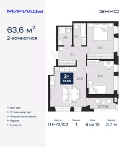 2-комн. квартира от застройщика с предчистовой отделкой в ЖК "Мириады" на 6 этаже. Общая площадь: 63.6 кв.м., жилая: 26 кв.м., площадь просторной кухни-столовой: 20.8 кв.м. Угловая квартира, идеально подойдет любителям тишины и панорамных видов. В квартире одна лоджия, два совмещенных санузла. Высота потолков 2.7 м.
