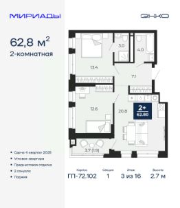 Просторная двухкомнатная квартира с предчистовой отделкой в ЖК "Мириады" на 3 этаже. Общая площадь: 62.8 кв.м., жилая: 26 кв.м., площадь просторной кухни-столовой: 20.8 кв.м. Квартира угловая, очень светлая, естественная вентиляция при открытии окон. В квартире одна лоджия, два совмещенных санузла. Высота потолков 2.7 м.