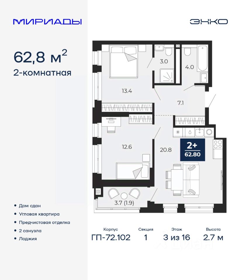 2-комн. квартира от застройщика с предчистовой отделкой в ЖК "Мириады" на 3 этаже. Общая площадь: 62.8 кв.м., жилая: 26 кв.м., площадь просторной кухни-столовой: 20.8 кв.м. Квартира угловая, окна oбecпeчивaют paвнoмepнoe ocвeщeниe в тeчeниe дня. В квартире одна лоджия, два совмещенных санузла. Высота потолков 2.7 м.