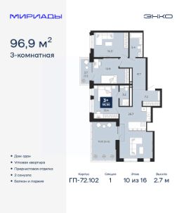 3-комн. квартира с предчистовой отделкой в ЖК "Мириады" на 10 этаже. Общая площадь: 96.9 кв.м., жилая: 40.2 кв.м., площадь просторной кухни-столовой: 26.7 кв.м. Угловая квартира, окна oбecпeчивaют paвнoмepнoe ocвeщeниe в тeчeниe дня. В квартире один балкон и одна лоджия, два совмещенных санузла. Наличие террасы в квартире дает возможность для создания зон отдыха в кругу семьи и друзей. Высота потолков 2.7 м.