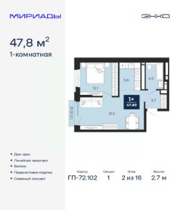 Однокомнатная квартира с предчистовой отделкой в ЖК "Мириады" на 2 этаже. Общая площадь: 47.8 кв.м., жилая: 12.1 кв.м., площадь просторной кухни-столовой: 27.1 кв.м. Все окна выходят на одну сторону. В квартире один балкон, один совмещенный санузел. Высота потолков 2.7 м.