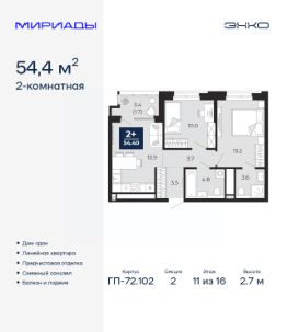 2-комн. квартира с предчистовой отделкой в ЖК "Мириады" на 11 этаже. Общая площадь: 54.4 кв.м., жилая: 23.2 кв.м., площадь просторной кухни-столовой: 13.9 кв.м. Комнаты изолированные, все окна выходят на одну сторону. В квартире два балкона и одна лоджия, один совмещенный санузел. Высота потолков 2.7 м.