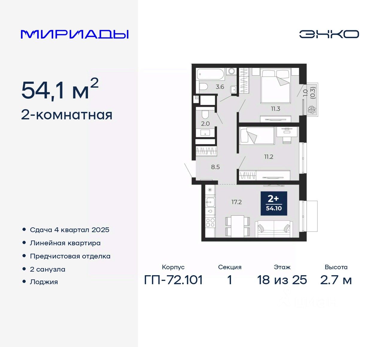 Просторная двухкомнатная квартира с предчистовой отделкой в ЖК "Мириады" на 18 этаже. Общая площадь: 54.1 кв.м., жилая: 22.5 кв.м., площадь просторной кухни-столовой: 17.2 кв.м. Комнаты изолированные, все окна выходят на одну сторону. В квартире одна лоджия, один совмещенный и один раздельный санузел. Высота потолков 2.7 м.