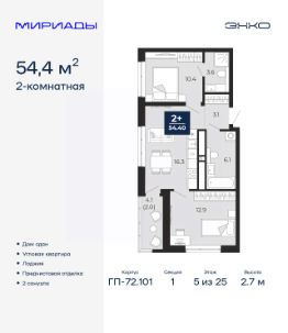 2-комн. квартира с предчистовой отделкой в ЖК "Мириады" на 5 этаже. Общая площадь: 54.4 кв.м., жилая: 23.3 кв.м., площадь просторной кухни-столовой: 16.3 кв.м. Квартира угловая, идеально подойдет любителям тишины и панорамных видов. В квартире одна лоджия, два совмещенных санузла. Высота потолков 2.7 м.