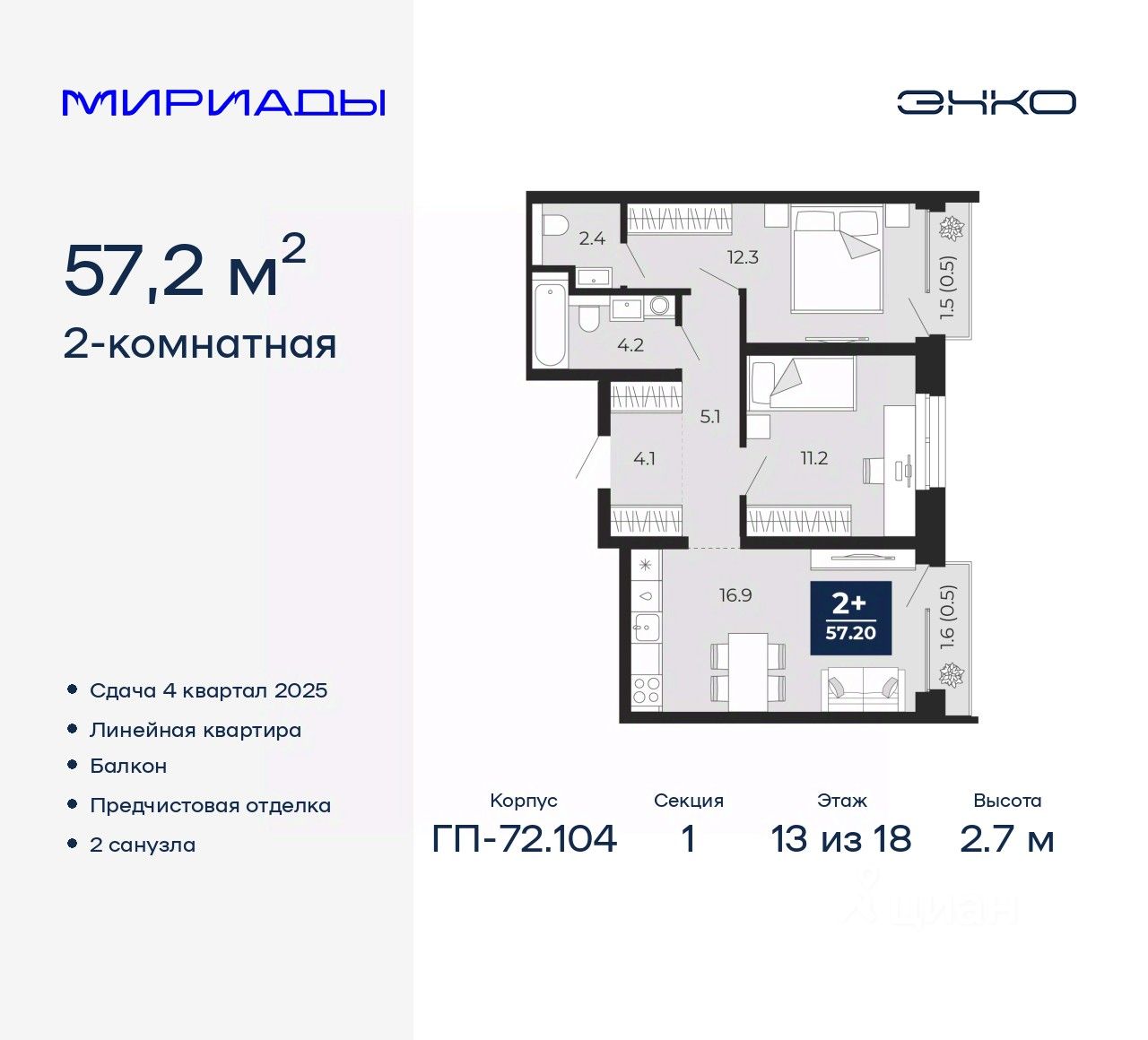 2-комн. квартира от застройщика с предчистовой отделкой в ЖК "Мириады" на 13 этаже. Общая площадь: 57.2 кв.м., жилая: 23.5 кв.м., площадь просторной кухни-столовой: 16.9 кв.м. Комнаты изолированные, все окна выходят на одну сторону. В квартире два балкона, один совмещенный и один раздельный санузел. Высота потолков 2.7 м.