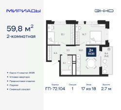 Продается двухкомнатная квартира с предчистовой отделкой в ЖК "Мириады" на 17 этаже. Общая площадь: 59.8 кв.м., жилая: 27.8 кв.м., площадь просторной кухни-столовой: 16 кв.м. Квартира угловая, идеально подойдет любителям тишины и панорамных видов. В квартире одна лоджия, один совмещенный санузел. Высота потолков 2.7 м.