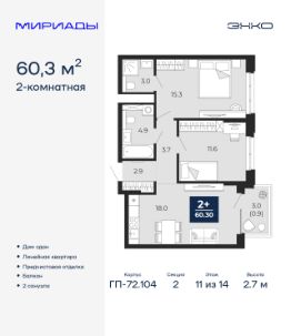 Продается двухкомнатная квартира с предчистовой отделкой в ЖК "Мириады" на 11 этаже. Общая площадь: 60.3 кв.м., жилая: 26.9 кв.м., площадь просторной кухни-столовой: 18 кв.м. Комнаты изолированные, все окна выходят на одну сторону. В квартире один балкон, два совмещенных санузла. Высота потолков 2.7 м.