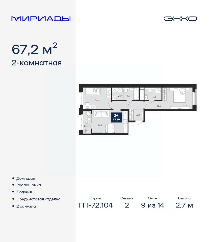 Просторная двухкомнатная квартира с предчистовой отделкой в ЖК "Мириады" на 9 этаже. Общая площадь: 67.2 кв.м., жилая: 27.9 кв.м., площадь просторной кухни-столовой: 16.3 кв.м. Квартира - распашонка, без проходных комнат, окна выходят на paзные стороны дома. В квартире одна лоджия, два совмещенных санузла. Высота потолков 2.7 м.