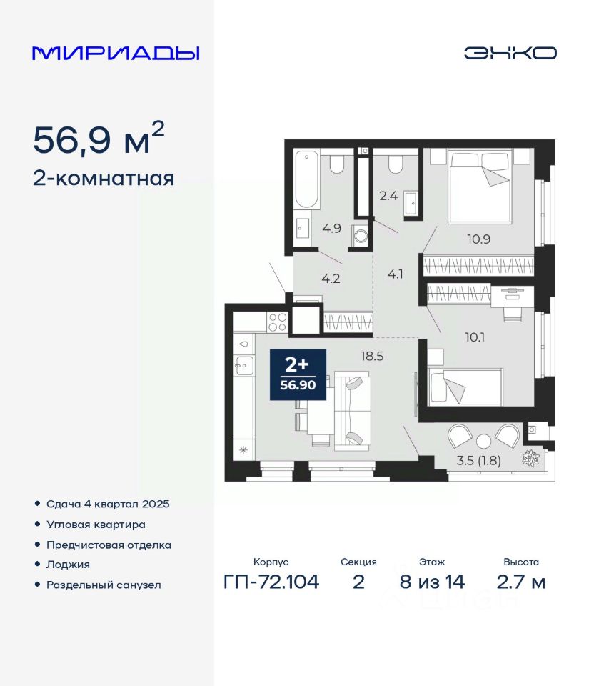 Продается 2-комн. квартира с предчистовой отделкой в ЖК "Мириады" на 8 этаже. Общая площадь: 56.9 кв.м., жилая: 21 кв.м., площадь просторной кухни-столовой: 18.5 кв.м. Угловая квартира, очень светлая, естественная вентиляция при открытии окон. В квартире одна лоджия, один раздельный санузел. Высота потолков 2.7 м.