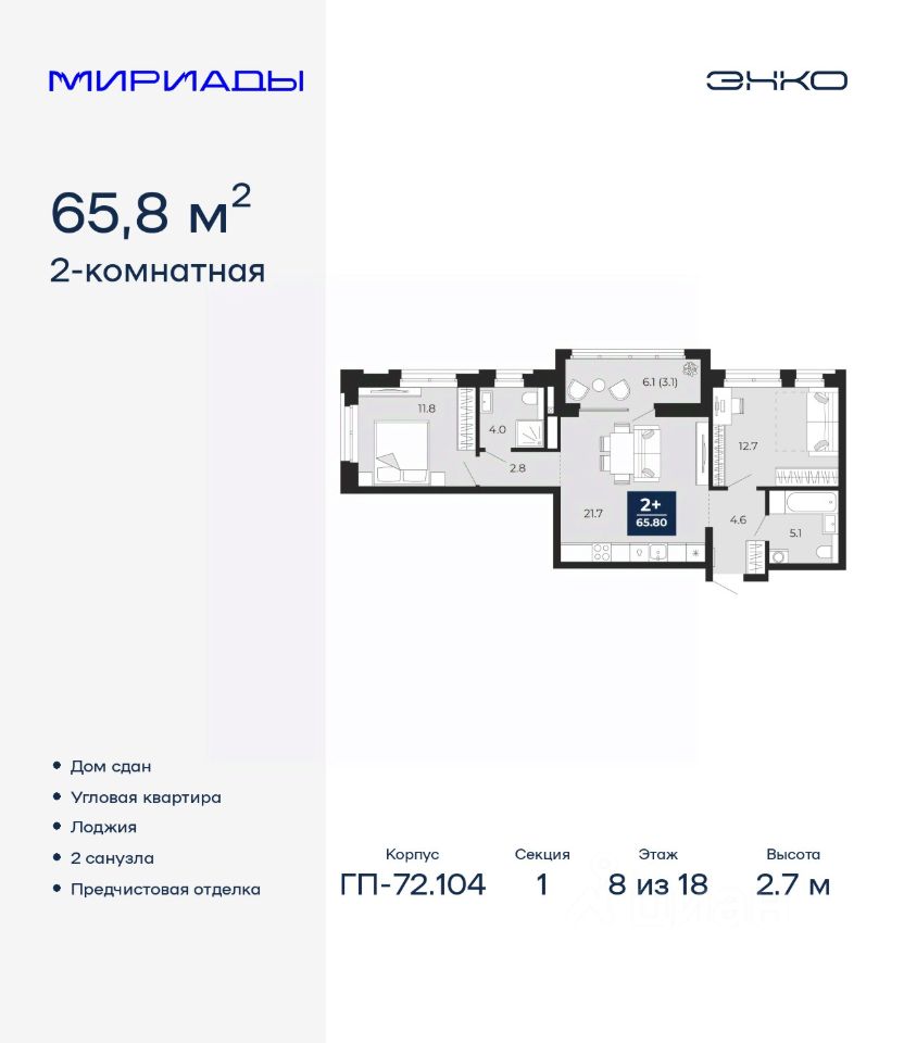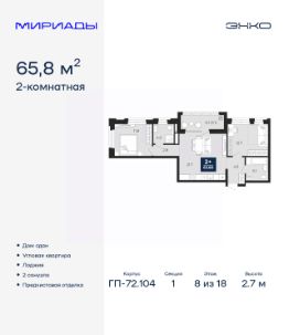 Продается 2-комн. квартира с предчистовой отделкой в ЖК "Мириады" на 8 этаже. Общая площадь: 65.8 кв.м., жилая: 24.5 кв.м., площадь просторной кухни-столовой: 21.7 кв.м. Угловая квартира, идеально подойдет любителям тишины и панорамных видов. В квартире одна лоджия, два совмещенных санузла. Высота потолков 2.7 м.