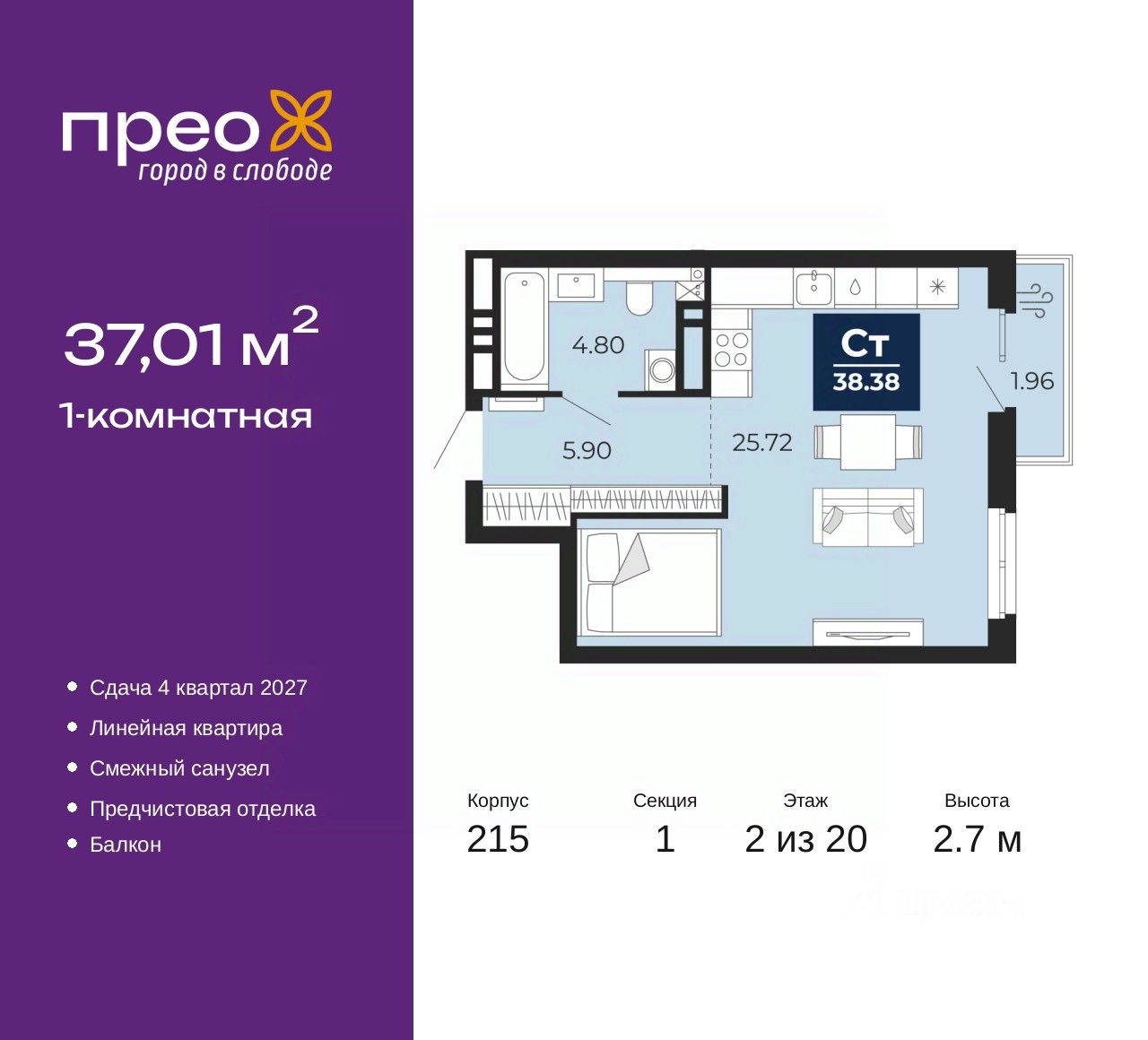 1-комн. квартира от застройщика с предчистовой отделкой в ЖК "Прео" на 2 этаже. Общая площадь: 37.01 кв.м., жилая: 20.72 кв.м., площадь кухни: 5 кв.м. Все окна выходят на одну сторону. В квартире один балкон, один совмещенный санузел. Высота потолков 2.7 м.