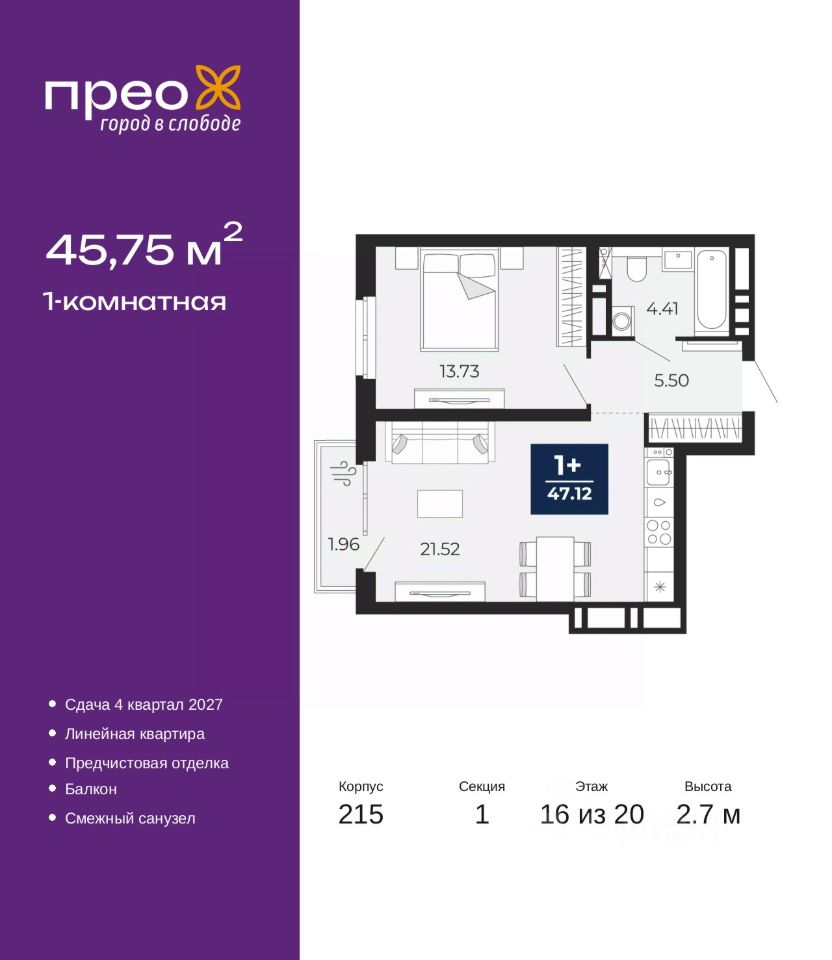 1-комн. квартира с предчистовой отделкой в ЖК "Прео" на 16 этаже. Общая площадь: 45.75 кв.м., жилая: 13.73 кв.м., площадь просторной кухни-столовой: 21.52 кв.м. Все окна выходят на одну сторону. В квартире один балкон, один совмещенный санузел. Высота потолков 2.7 м.