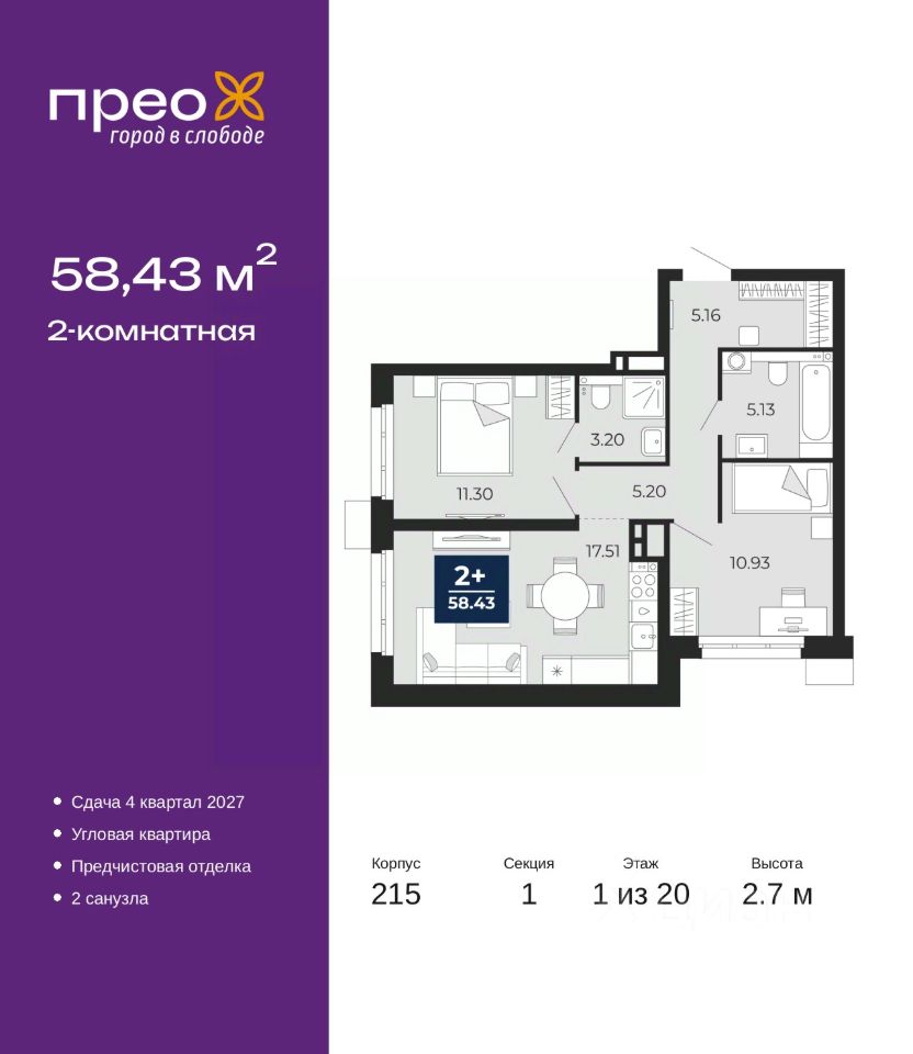 Продается 2-комн. квартира с предчистовой отделкой в ЖК "Прео" на 1 этаже. Общая площадь: 58.43 кв.м., жилая: 22.23 кв.м., площадь просторной кухни-столовой: 17.51 кв.м. Угловая квартира, окна oбecпeчивaют paвнoмepнoe ocвeщeниe в тeчeниe дня. В квартире два совмещенных санузла. Высота потолков 2.7 м.