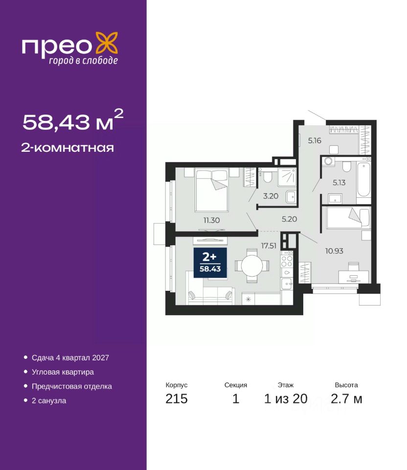 2-комн. квартира от застройщика с предчистовой отделкой в ЖК "Прео" на 1 этаже. Общая площадь: 58.43 кв.м., жилая: 22.23 кв.м., площадь просторной кухни-столовой: 17.51 кв.м. Угловая квартира, очень светлая, естественная вентиляция при открытии окон. В квартире два совмещенных санузла. Высота потолков 2.7 м. Квартира находится в корпусе 215. Дом монолитный, одноподъездный, высотой 20 этажей. На этаже 8 квартир. В подъезде 1 пассажирский и 1 грузовой лифт. Окончание строительства - 4 квартал 2027 года. Оформление сделки по договору долевого участия. Преображенский — один из самых привлекательных районов для жизни! Это полностью самостоятельный жилой район с точки зрения инфраструктуры. Преображенский находится между Московским и Червишевским трактами в квартале улиц Закалужская — Вьюжная — Александра Протозанова. Не нужно ждать, когда появится инфраструктура — переезжайте на всё готовое. Вблизи расположены действующие школа и детский сад. В этом году откроется еще один сад, а в следующем году — школа. По соседству с Преображенским запланировано строительство городского парка "Комарово" площадью 38 гектар. За 10 минут можно доехать на автомобиле до крупных ТРЦ: "Лента", "Кристалл", "Леруа Мерлен", "Метро" и "Ашан". С 2018 года в районе открыт Соседский центр — пространство, созданное для формирования добрососедской среды, совместного досуга, общения и реализации соседских инициатив. Здесь проходят встречи соседей, а также сами жители района организовывают мероприятия. Организатором такого события может стать любой желающий. В квартирах выполнена качественная предчистовая отделка. Гладкие стены с финишным выравниванием по маякам. Ровный потолок для установки натяжного потолка. Установлены пятикамерные окна с двойным стеклопакетом (3 стекла). Дизайнерские холлы с видеонаблюдением, безбарьерным и прозрачным входом всегда светло и спокойно. На первом этаже есть просторные колясочные, где все жители могут оставлять свои коляски и велосипеды. В Преображенском есть всё, что нужно для активного отдыха и занятий спортом. Мы сделали большое футбольное поле с безопасным покрытием. Также установили хоккейный корт, который оборудован по всем необходимым стандартам. Во дворах можно делать упражнения на специальных площадках с турниками. Весь район мы обустроили велодорожками, которые связаны в единый маршрут. У нас есть сухие фонтаны, бьющие из земли, деревья, веревки, сетки, скалодром, газон, песок и резинка — осталось просто дать своему ребенку право на свободную игру. По-настоящему хорошие дворы — это те, которые дети предпочитают соцсетям и телевизору. Аккредитация в банках: ОАО "Альфа-Банк", "Сбербанк России", ПАО "Банк Уралсиб", ПАО "Газпромбанк", ПАО Банк "ВТБ" и других. #Z68g5w