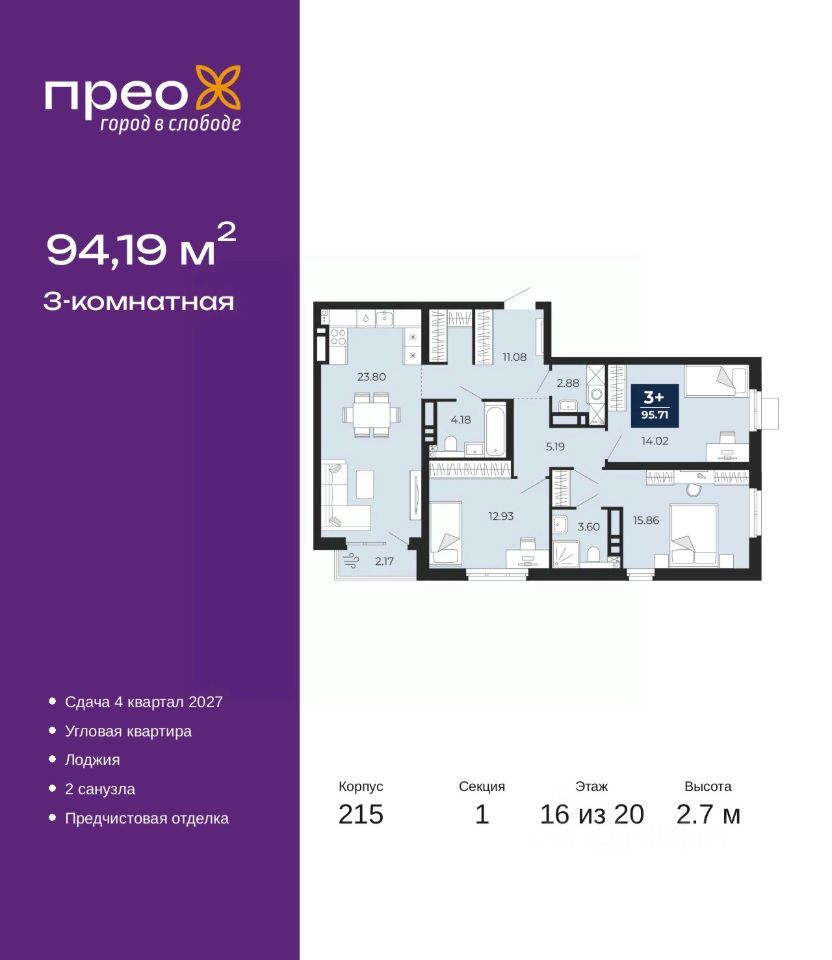 Просторная трехкомнатная квартира с предчистовой отделкой в ЖК "Прео" на 16 этаже. Общая площадь: 94.19 кв.м., жилая: 42.81 кв.м., площадь просторной кухни-столовой: 23.8 кв.м. Угловая квартира, окна oбecпeчивaют paвнoмepнoe ocвeщeниe в тeчeниe дня. В квартире одна лоджия, два совмещенных санузла. Высота потолков 2.7 м.