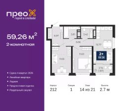 2-комн. квартира от застройщика с предчистовой отделкой в ЖК "Прео" на 14 этаже. Общая площадь: 59.26 кв.м., жилая: 23.26 кв.м., площадь просторной кухни-столовой: 15.77 кв.м. Комнаты изолированные, все окна выходят на одну сторону. В квартире одна лоджия, один раздельный санузел. Высота потолков 2.7 м.