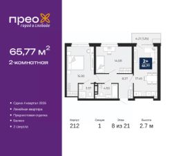 Просторная 2-комн. квартира с предчистовой отделкой в ЖК "Прео" на 8 этаже. Общая площадь: 65.77 кв.м., жилая: 30.88 кв.м., площадь просторной кухни-столовой: 17.49 кв.м. Комнаты изолированные, все окна выходят на одну сторону. В квартире один балкон, два совмещенных санузла. Высота потолков 2.7 м.