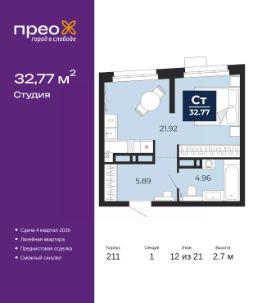 Однокомнатная квартира-студия с предчистовой отделкой в ЖК "Прео" на 12 этаже. Общая площадь: 32.77 кв.м., площадь гостиной 21.92 кв.м., из которых 10 кв.м. выделено под кухонную зону. Все окна выходят на одну сторону. В квартире один совмещенный санузел. Высота потолков 2.7 м.