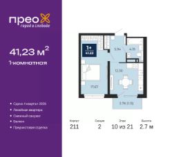 Просторная 1-комн. квартира с предчистовой отделкой в ЖК "Прео" на 10 этаже. Общая площадь: 41.23 кв.м., жилая: 17.67 кв.м., площадь просторной кухни-столовой: 12.3 кв.м. Все окна выходят на одну сторону. В квартире один балкон, один совмещенный санузел. Высота потолков 2.7 м.