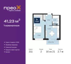 Однокомнатная квартира с предчистовой отделкой в ЖК "Прео" на 16 этаже. Общая площадь: 41.23 кв.м., жилая: 17.67 кв.м., площадь просторной кухни-столовой: 12.3 кв.м. Все окна выходят на одну сторону. В квартире один балкон, один совмещенный санузел. Высота потолков 2.7 м.