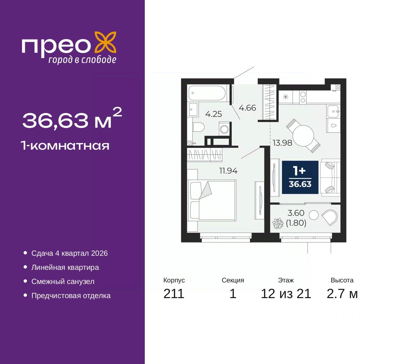 Просторная 1-комн. квартира с предчистовой отделкой в ЖК "Прео" на 12 этаже. Общая площадь: 36.63 кв.м., жилая: 11.94 кв.м., площадь просторной кухни-столовой: 13.98 кв.м. Все окна выходят на одну сторону. В квартире один совмещенный санузел. Высота потолков 2.7 м.