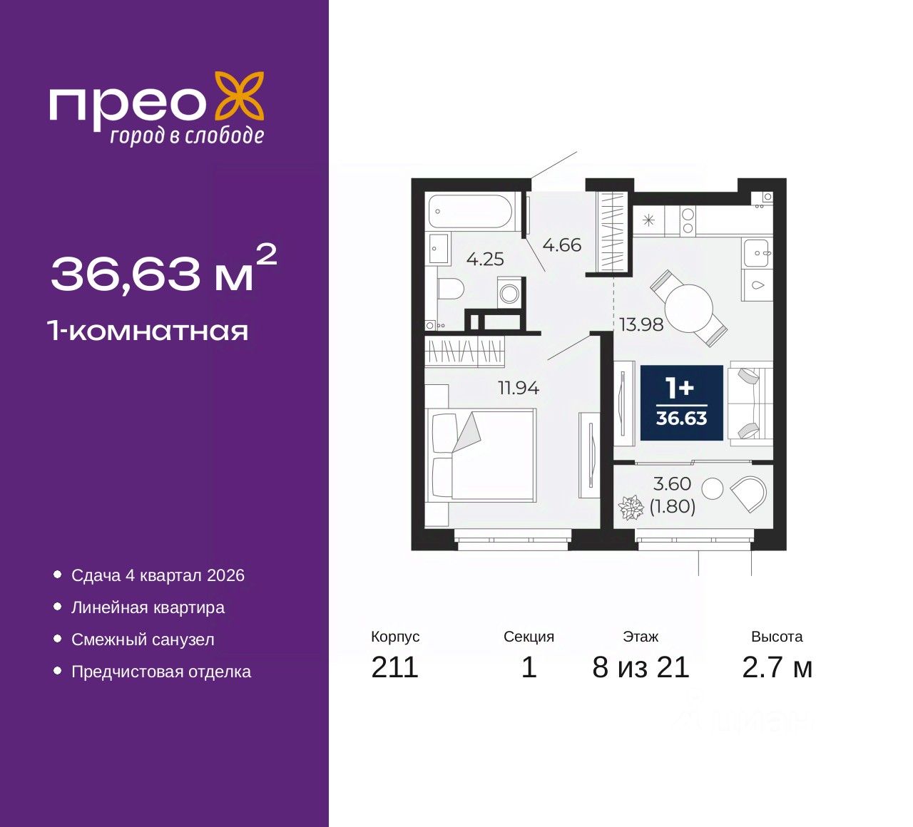 1-комн. квартира с предчистовой отделкой в ЖК "Прео" на 8 этаже. Общая площадь: 36.63 кв.м., жилая: 11.94 кв.м., площадь просторной кухни-столовой: 13.98 кв.м. Все окна выходят на одну сторону. В квартире один совмещенный санузел. Высота потолков 2.7 м.