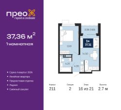 Продается 1-комн. квартира от застройщика с предчистовой отделкой в ЖК "Прео" на 16 этаже. Общая площадь: 37.36 кв.м., жилая: 12.61 кв.м., площадь просторной кухни-столовой: 14.5 кв.м. Все окна выходят на одну сторону. В квартире одна лоджия, один совмещенный санузел. Высота потолков 2.7 м.